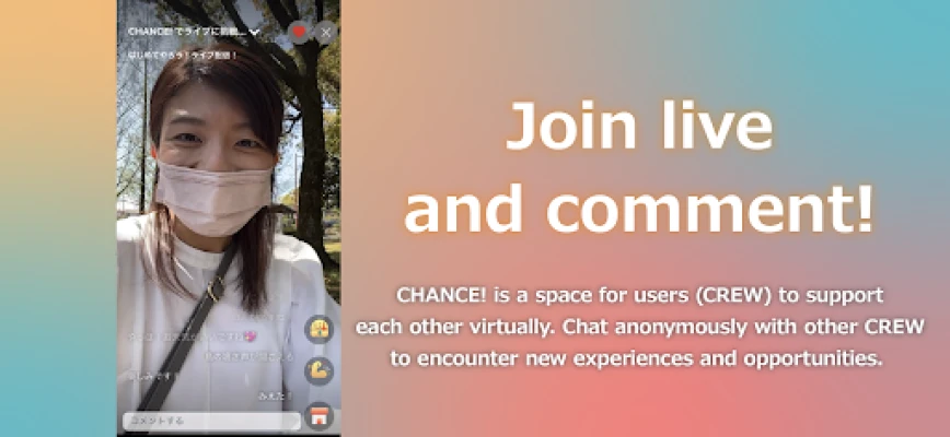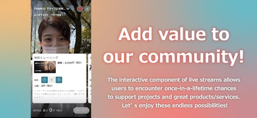 CHANCE! is a unique crowdfunding platform which allows users (CREW) to crowdfund through livestreaming. By interacting with audiences and other CREW, there are endless possibilities to share great products, services, ideas and experiences.
