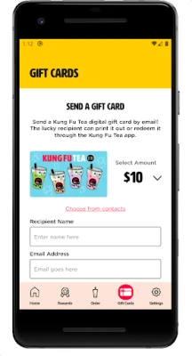 - DIGITAL GIFT CARDS: Easily send Kung Fu Tea e-gift cards to your friends and family.
