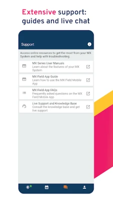 The app uses Bluetooth® wireless technology to connect to nearby MX Series systems. From the moment a system receives power, it automatically connects both locally to the MX Field App and remotely to MX Cloud, providing easy local and remote access to system status, settings and data. Quickly pair to the system by following the instructions inside the MX power module lid or by requesting a digital key from an MX Cloud administrator.